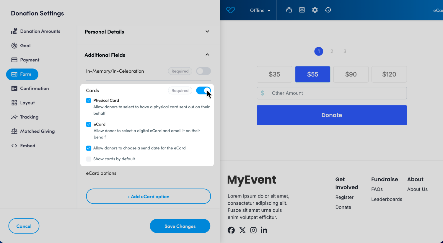 Tip! Want to make sending a card mandatory with a donation? Check Required to make this step compulsory for donors.