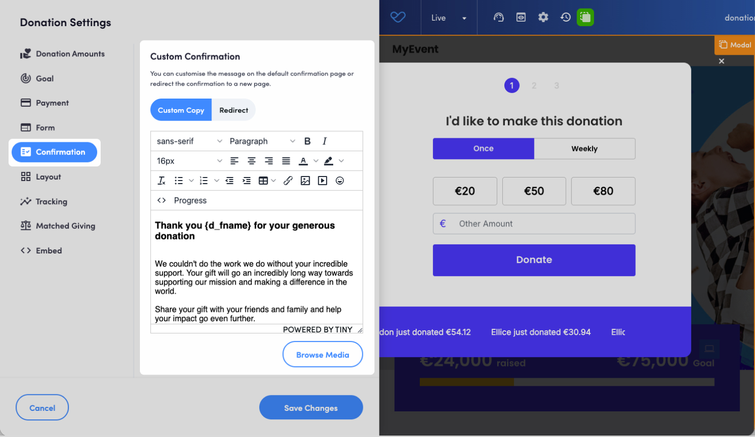 The modal can be styled and configured to align with your branding and campaign messaging, including donation amounts, recurring options, form fields, imagery, and content. You can also incorporate dynamic elements such as progress bars or scrolling tickers to reflect campaign momentum in real time.