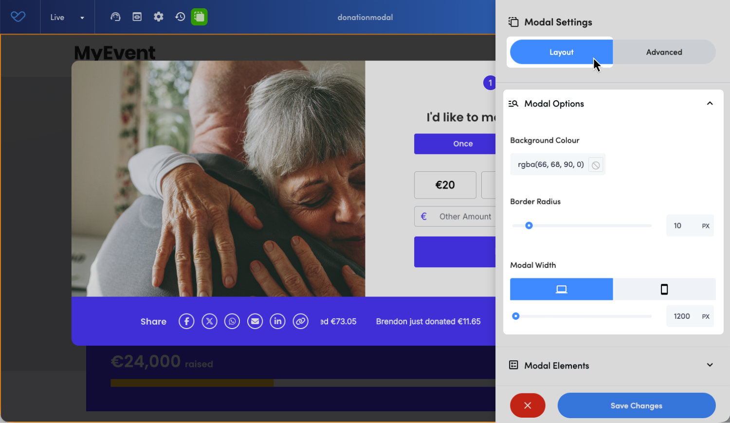 Once Modal Mode is enabled, you can adjust both the modal appearance and the donation form settings to match your branding and campaign needs.