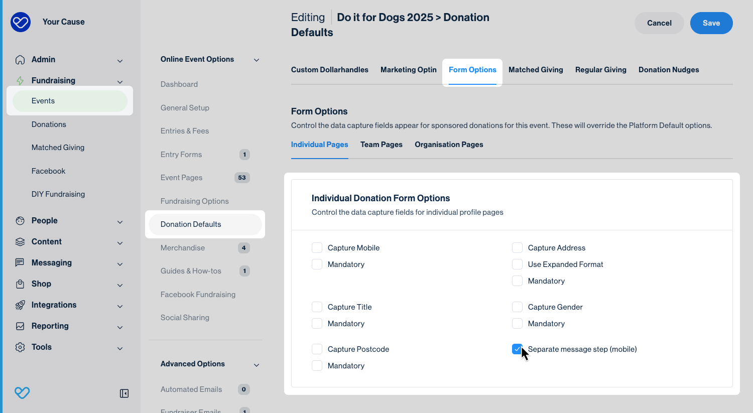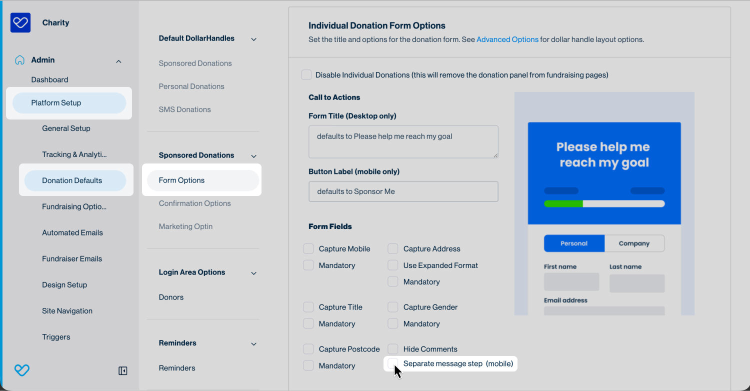 - In the Individual Donation Form Options section, tick the Separate message step (mobile) checkbox