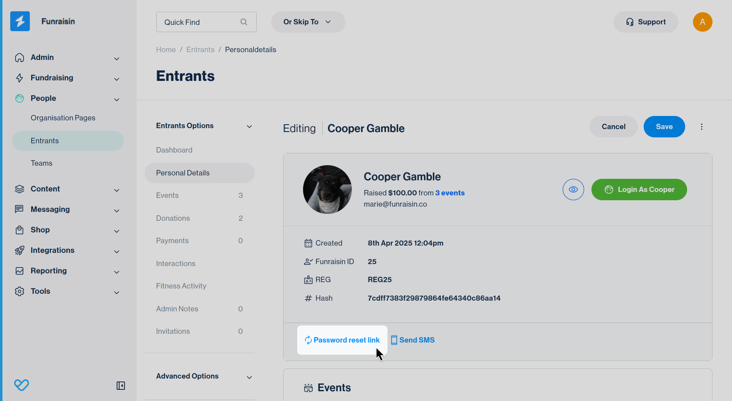 If your Supporter Care team is helping a fundraiser reset their password, you can access a unique reset link directly from their member record.