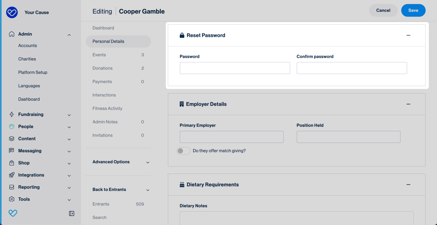 Admins can add an extra layer of security by requiring fundraisers to enter their current password before setting a new one.