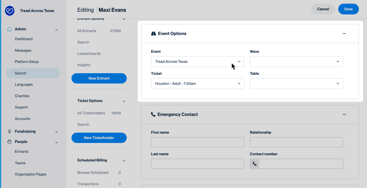 Both tasks can be managed quickly from within the entrant record—ensuring your supporters are linked to the right events and their fundraising history remains accurate.
