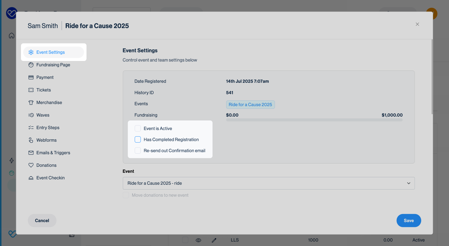 Click the edit icon next to the new event. In the pop-up, tick Event is Active and click Save to make their fundraising page live.
