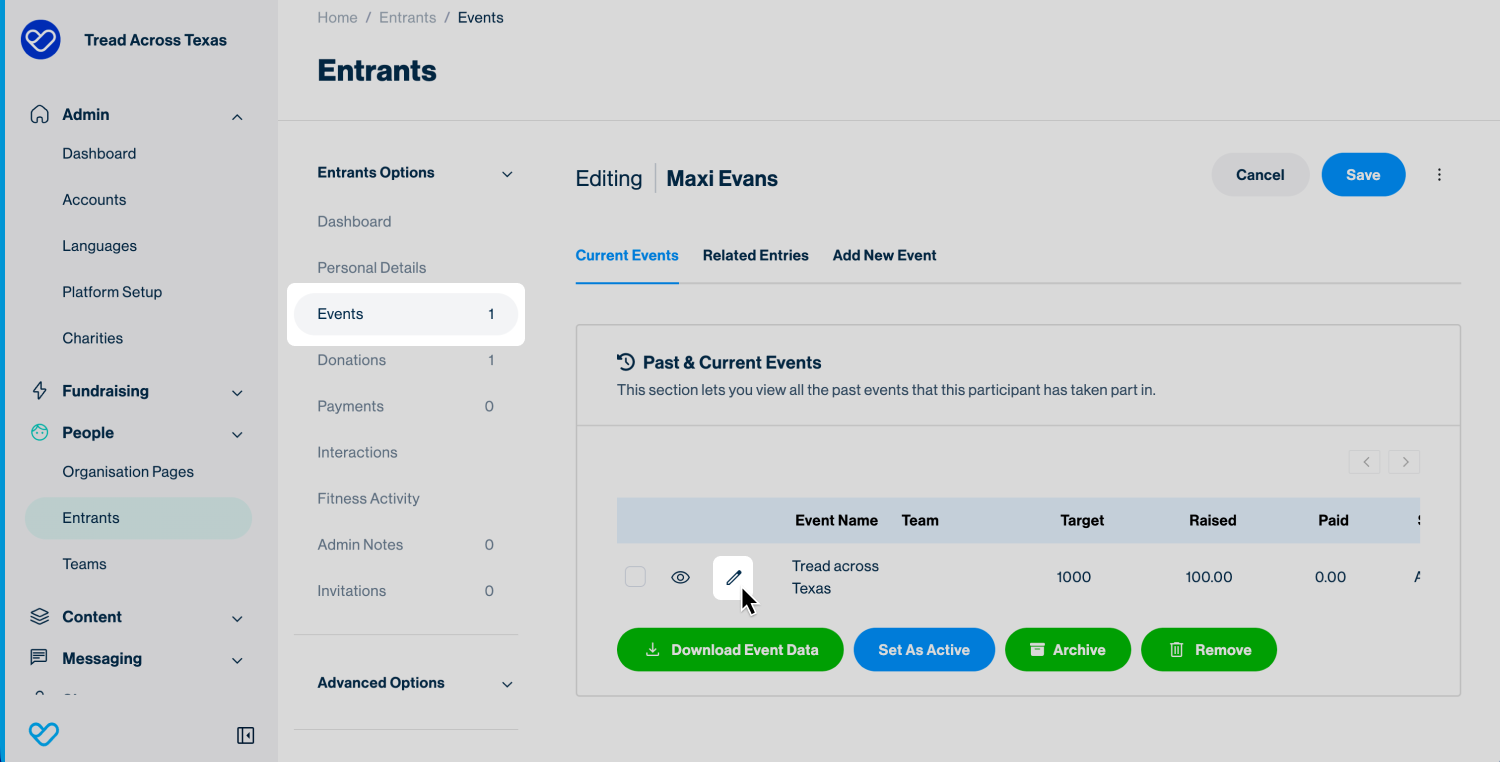 Once saved, the new event will appear in the entrant’s Past & Current Events list. The entrant will be inactive (they will not have a live fundraising page), indicated by the missing preview icon (eye) and a Status of ‘Inactive.’
