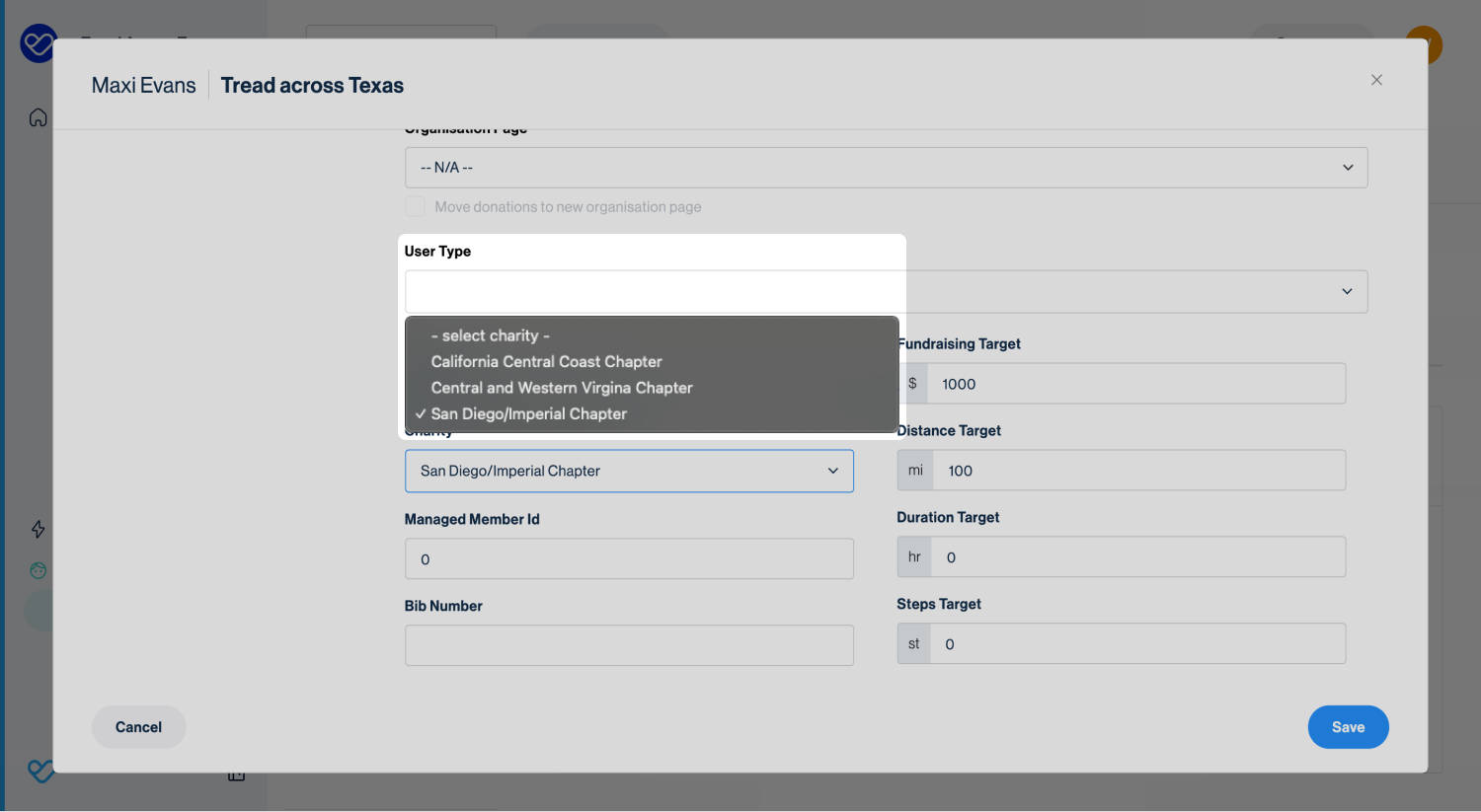 You’ll also need to update the entrant’s event record to the new charity so that future donations are assigned correctly. In the same pop-up, scroll down to the charity dropdown and select the new charity.