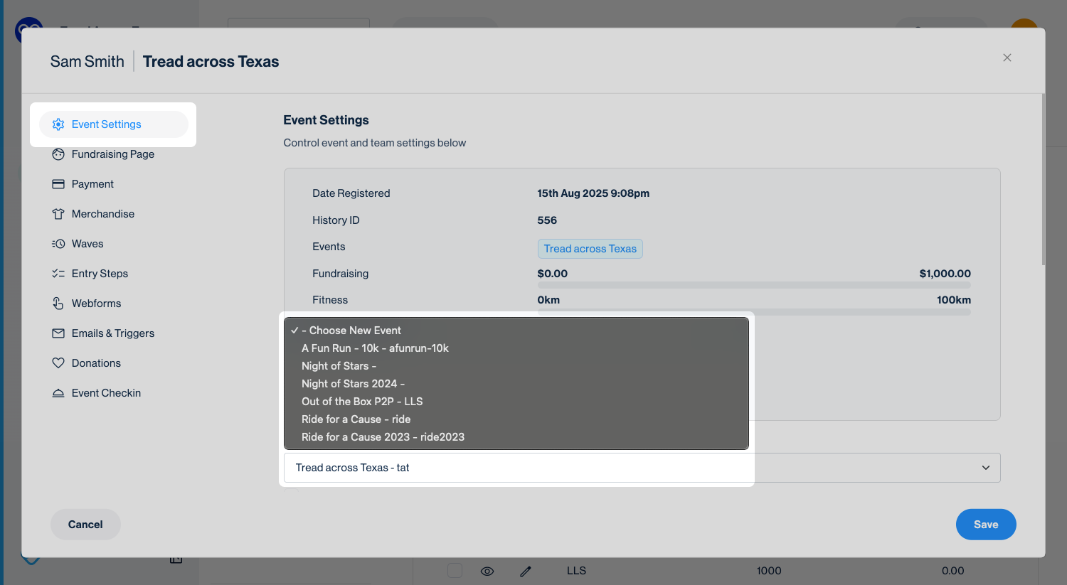 From the event dropdown list, select the event you want to move them to. Make sure to tick Move donations to new event so their donations carry across. When finished, click Save and the entrant will be reassigned.