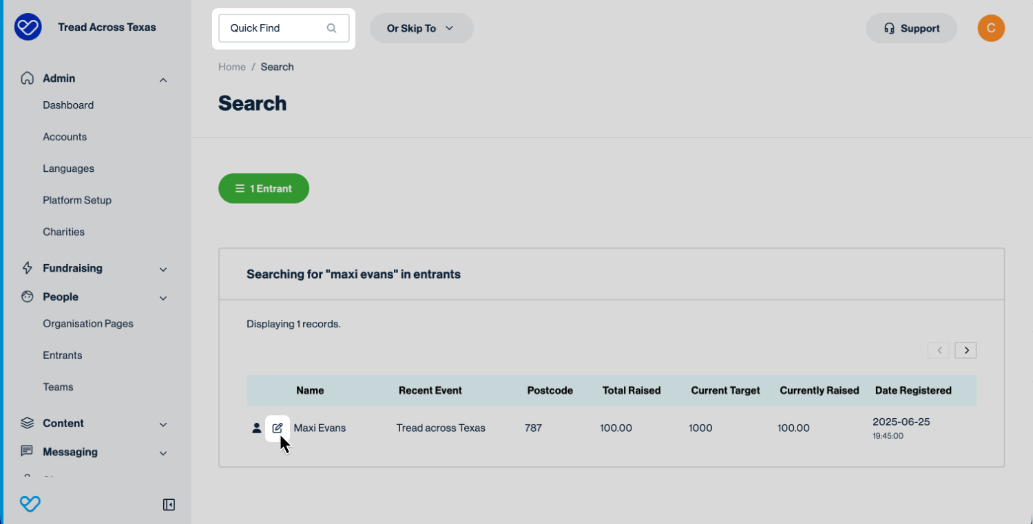 - Use the Quick Find search at the top of your platform to locate the entrant by name or, most reliably, by email address.