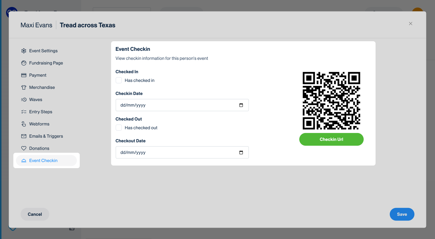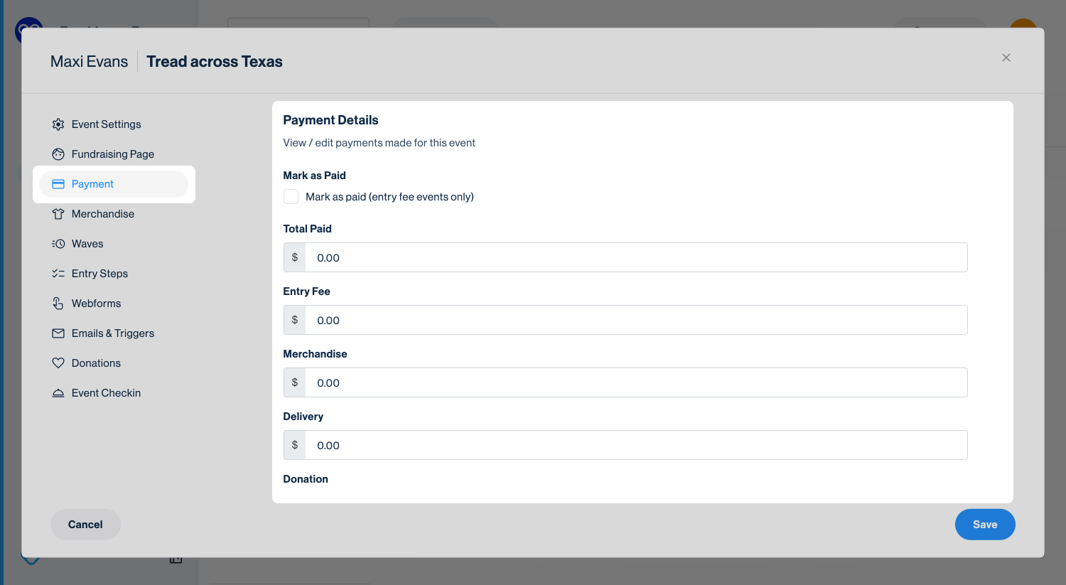 The first tab you’ll see in the event details lightbox is Event settings. This tab contains the core information about a fundraiser’s participation in a specific event.