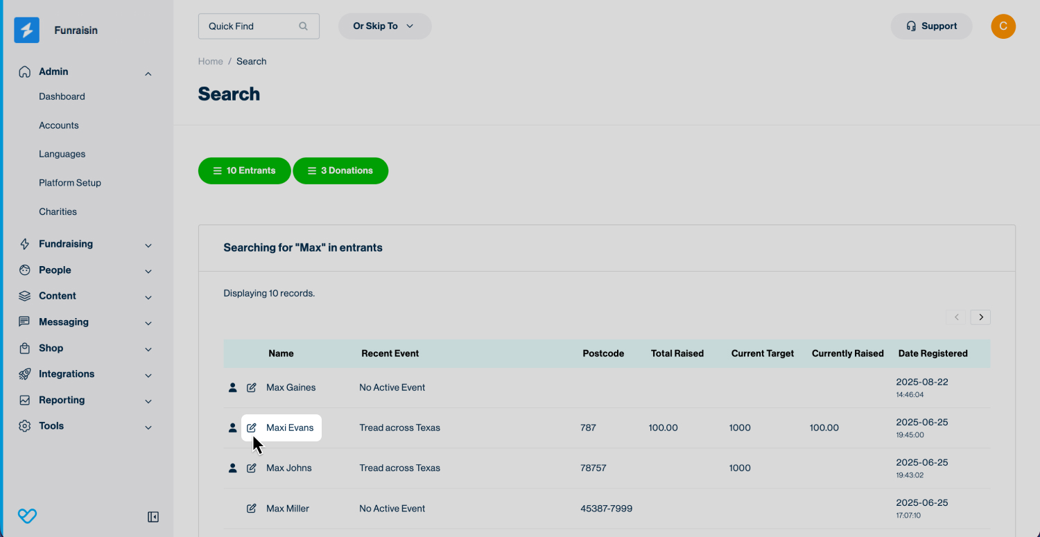 Every time a supporter signs up for an event, an entrant record is created. This record not only stores their personal information but also keeps track of every event they’ve taken part in—past and present—alongside their fundraising activity.