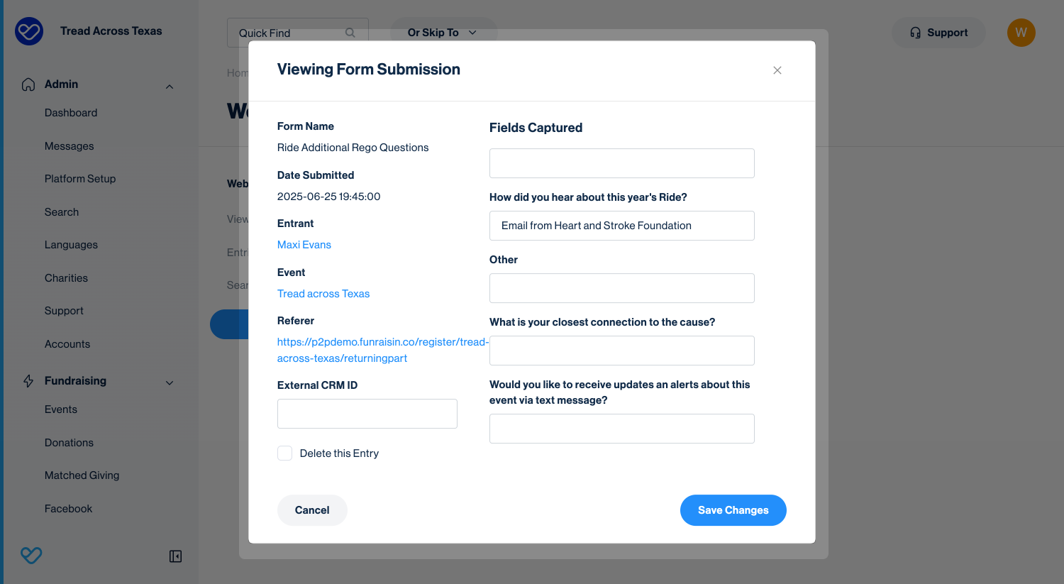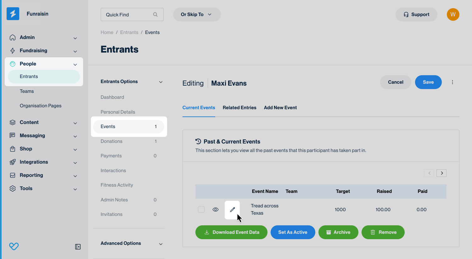 Tip! Click the edit icon to edit the responses submitted by the entrant. This is useful if a fundraiser made a mistake or needs their information updated.