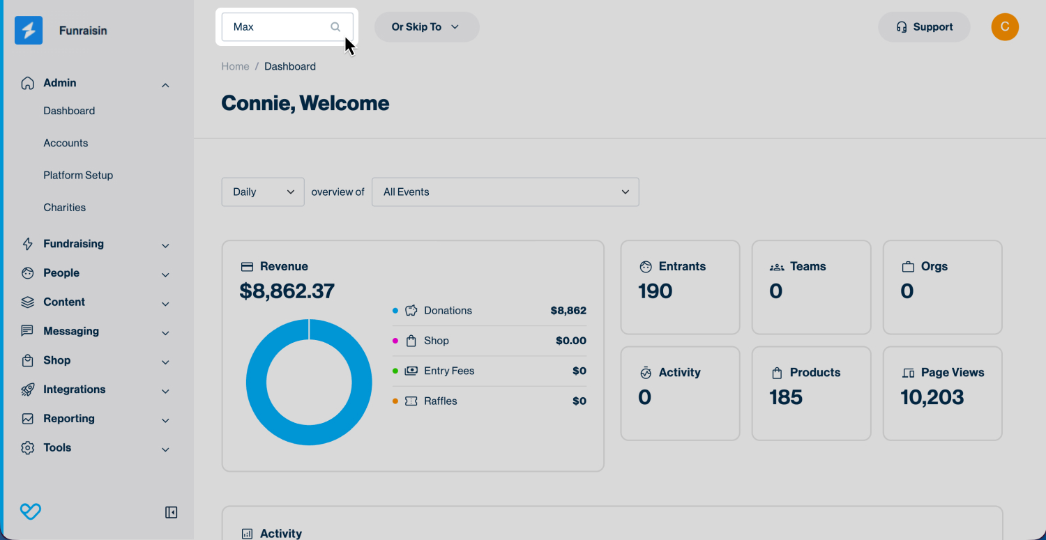 The fastest way to find a fundraiser’s record is with the Quick Find search bar located at the top of your platform.