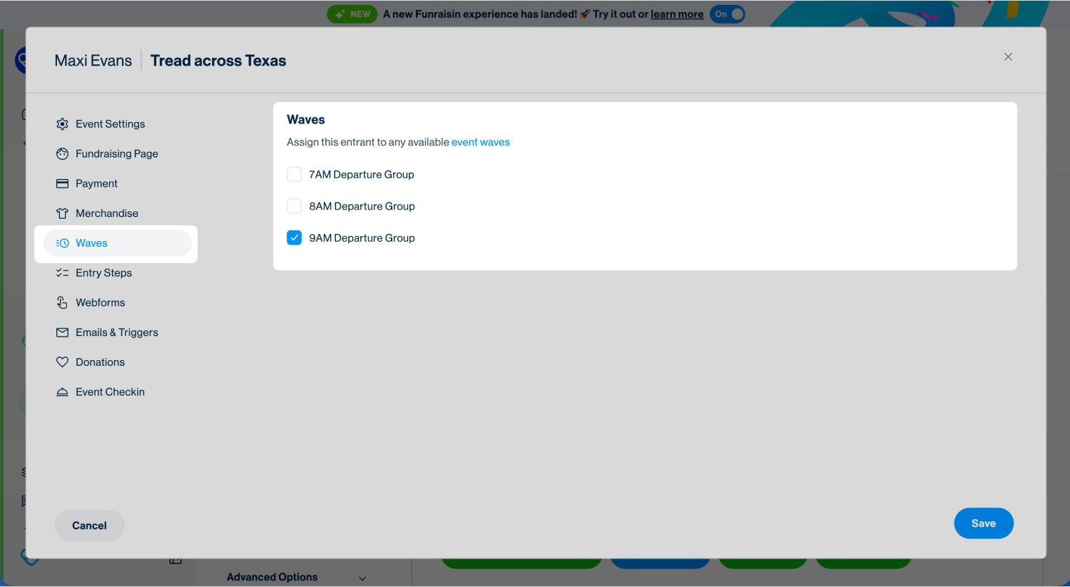 If your event uses waves, all available options will be listed in this tab. The fundraiser’s assigned wave will be ticked.