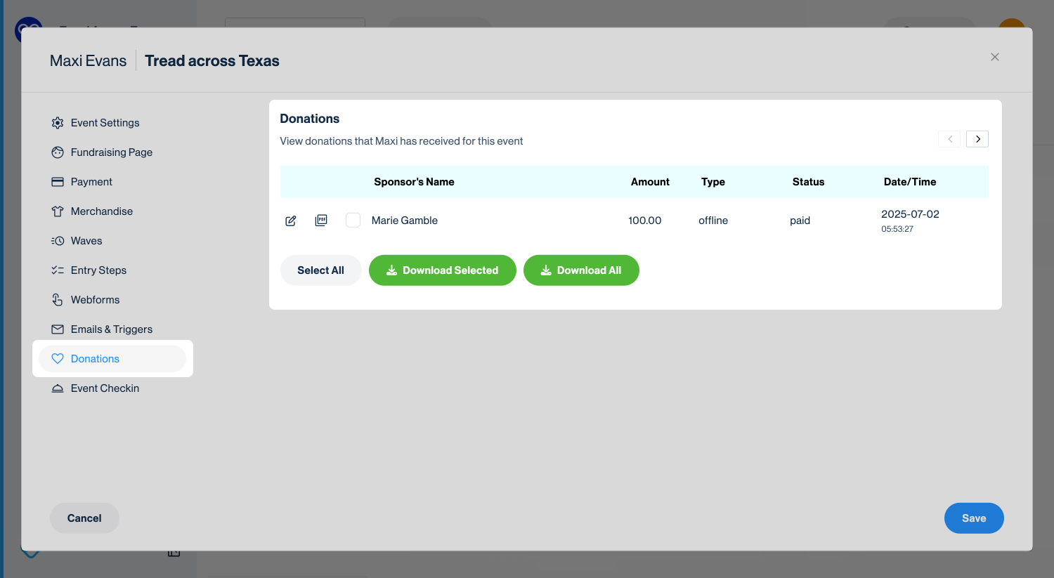Tip! You can also download a report of all donations made to this entrant, making it easy to review or share their fundraising history.