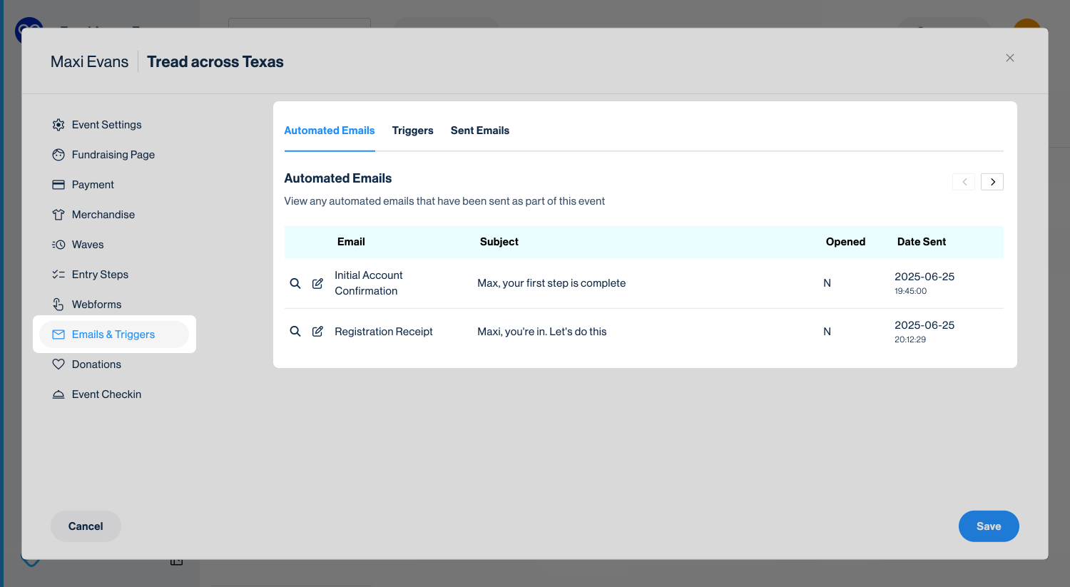 Triggers: Displays any automated trigger emails (e.g. milestones, nudges, reminders) the entrant has received, along with the date they were sent. A toggle at the top allows you to opt the entrant out of receiving future trigger emails for this specific event.