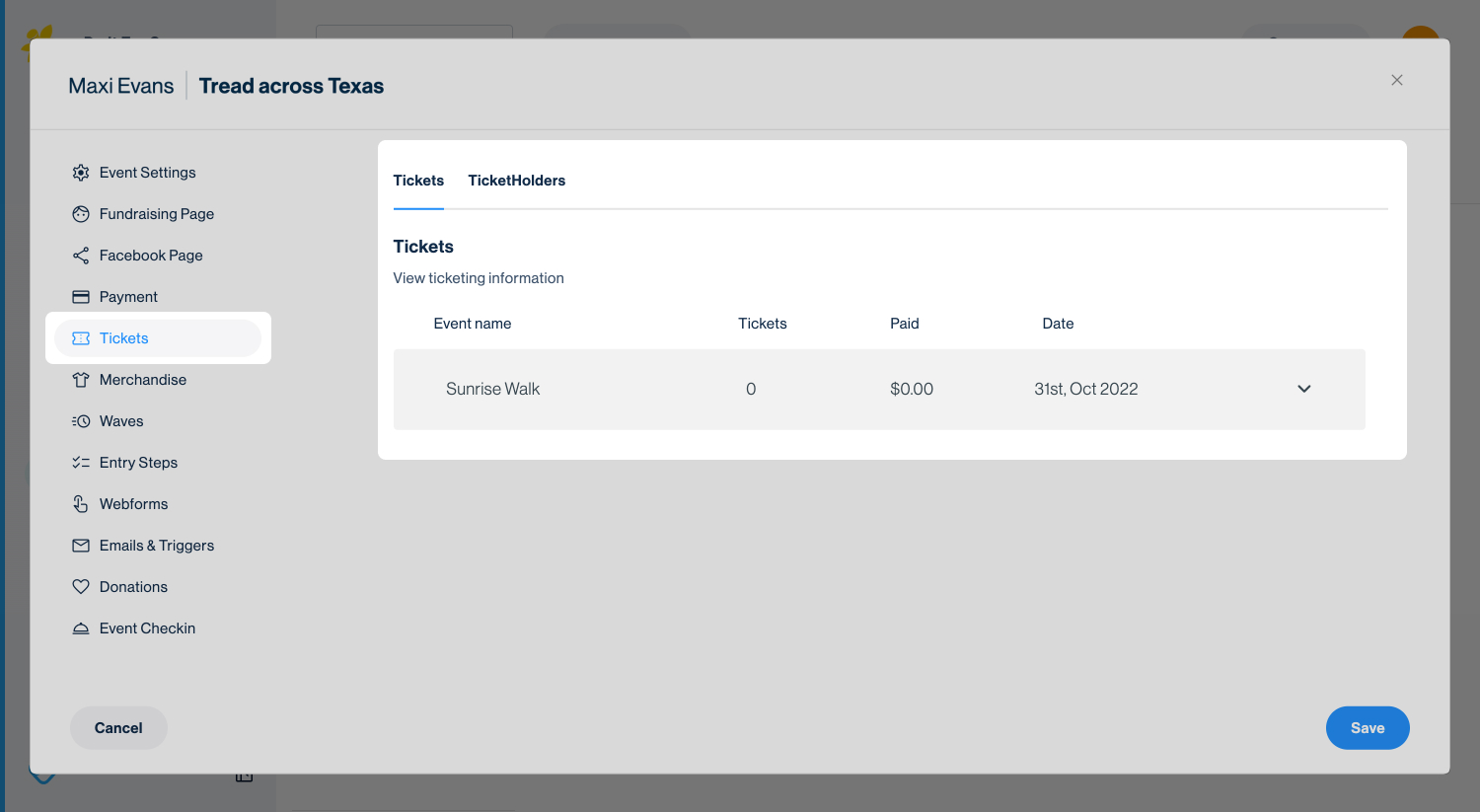 If your offline event is ticketed, the Tickets tab will display details of any tickets that have been purchased.