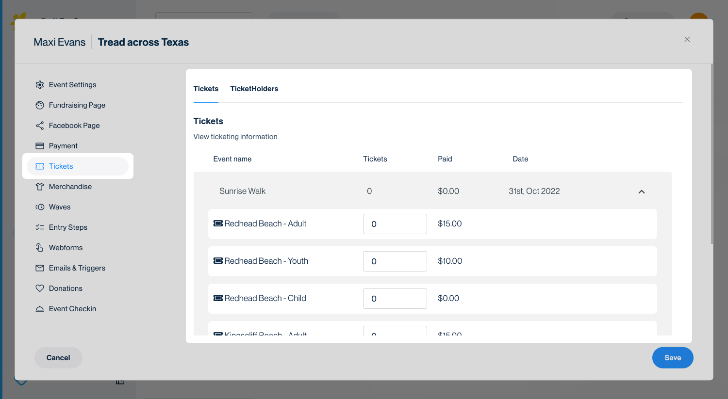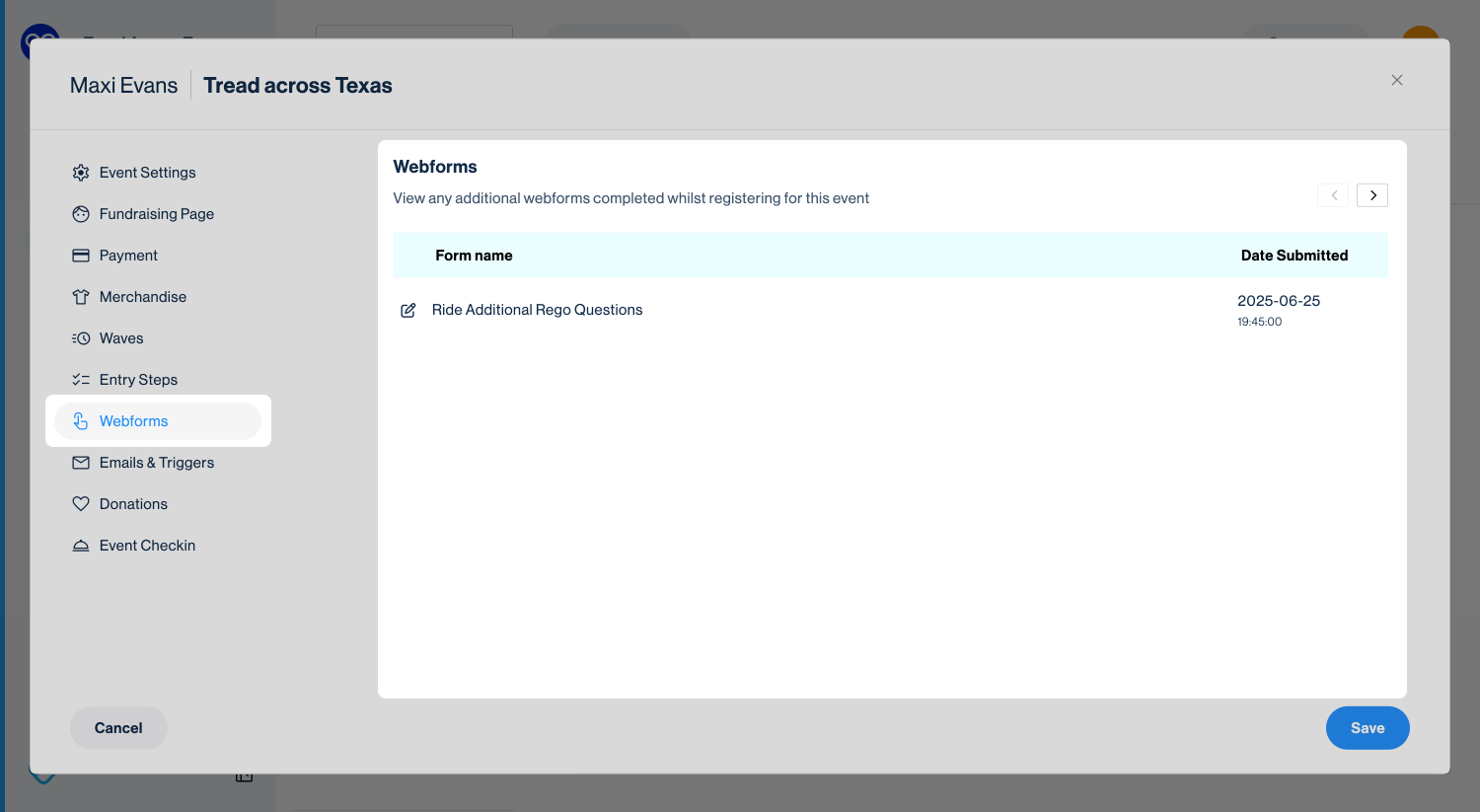 To edit a fundraiser’s participation details, click the edit icon next to the event. This opens a lightbox where you can view and update all of their event-specific information.