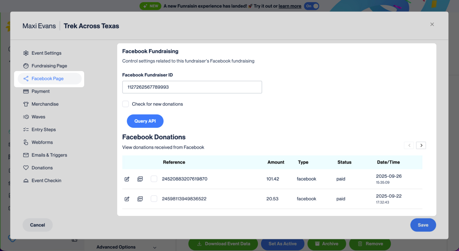 If the supporter has a connected Facebook page then the ID number will be noted here. There is the option to tick Check for new donations > Query API. This will re-sync with Facebook to pull through donations from their Facebook page to Funraisin.