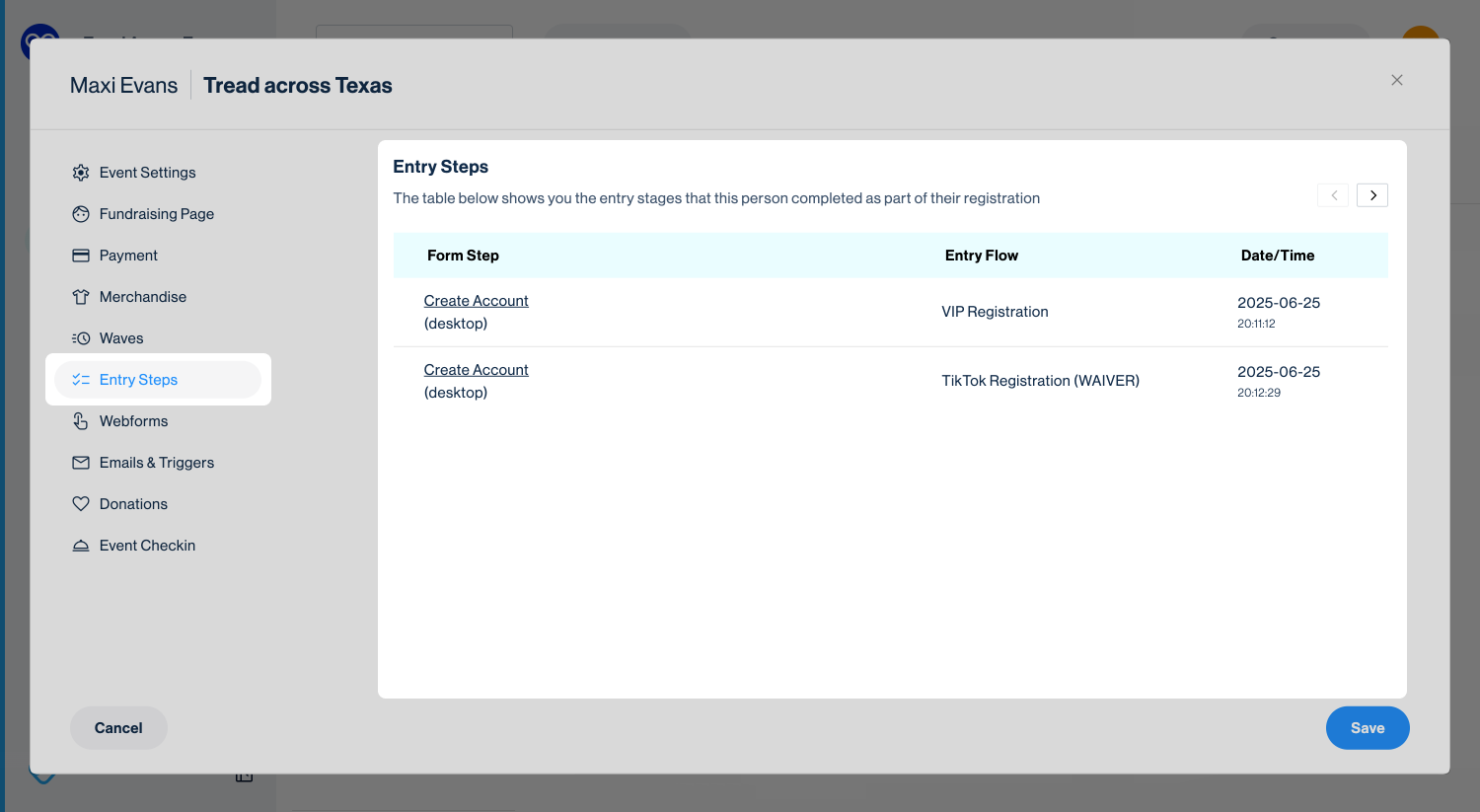 The Entry steps tab provides a detailed record of how the fundraiser registered for the event. This section will only show for Online events. It shows:
