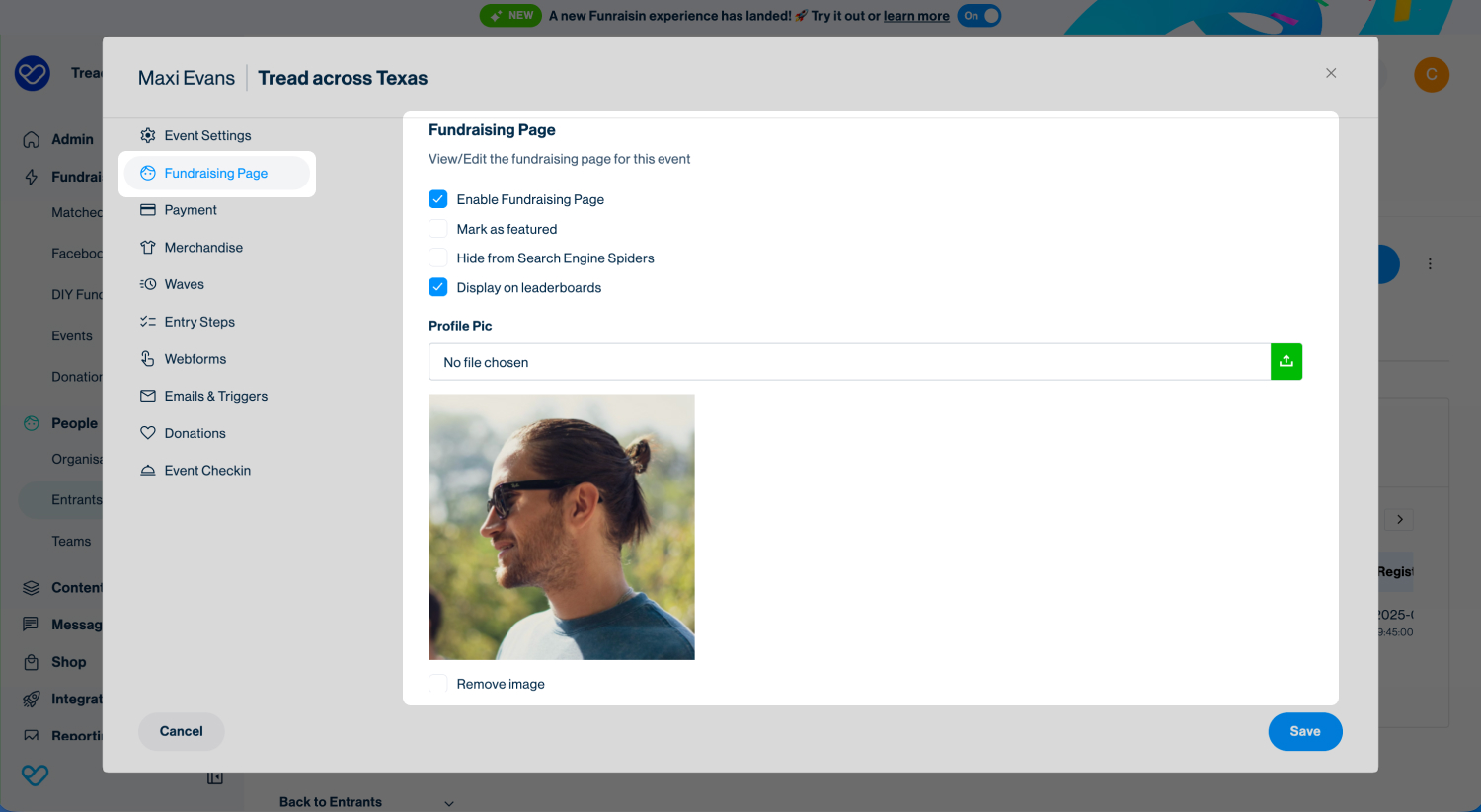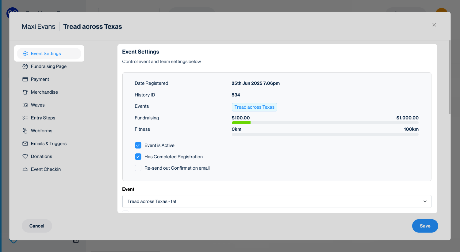 Event is active: Automatically ticked once the fundraiser completes registration (unless the event requires manual approval). When ticked, their fundraising page is live. If unticked, their page is offline.