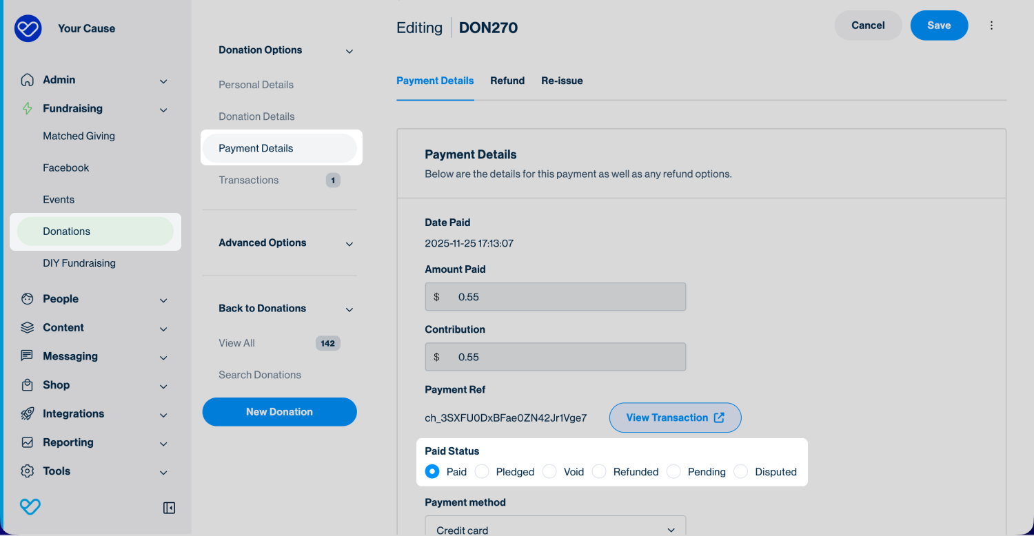 To update the transaction status, navigate to the Donation record > Payment details tab and scroll down to the Paid Status section.