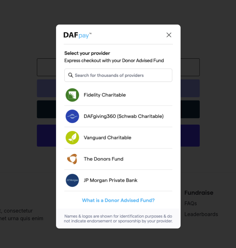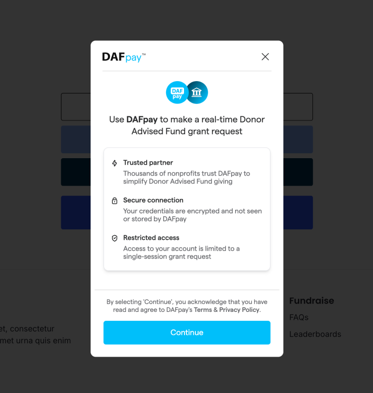 A Donor Advised Fund is a charitable giving account that allows donors to set aside money for future donations to nonprofits. By using DAFpay, donors can give straight from their fund without leaving your site or managing extra paperwork.