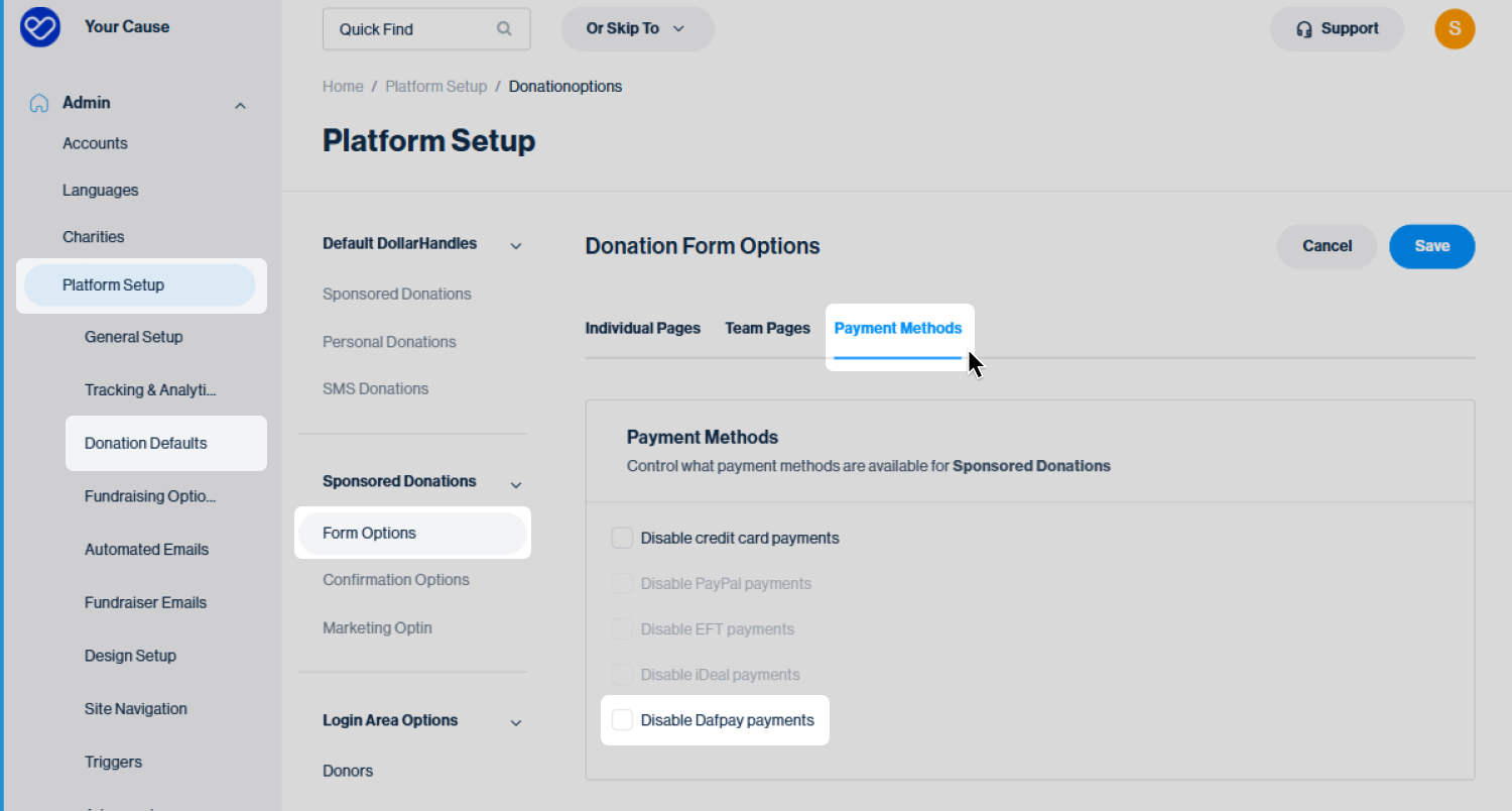 If you’d prefer to disable DAFpay across all Sponsored Donations: