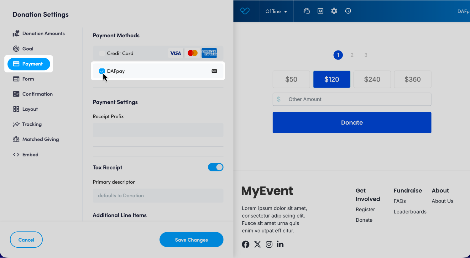When Enable DAFpay is toggled on in your Payment Settings, all Sponsored Donation forms will automatically include DAFpay as a payment option.