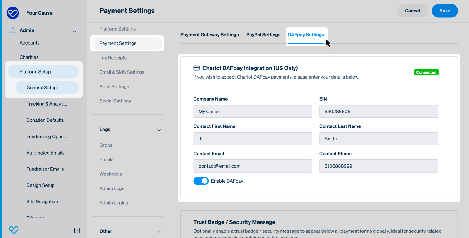 This article covers how to set up, manage, and report on DAFpay within your Funraisin platform.