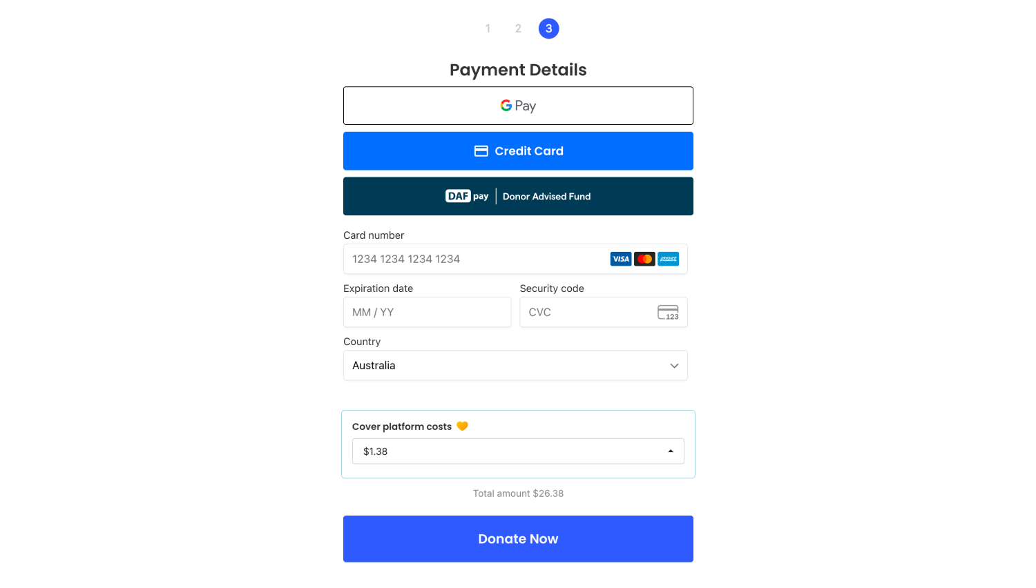 When DAFpay is enabled on a donation form, donors will see a Pay with DAFpay button alongside your other payment options.
