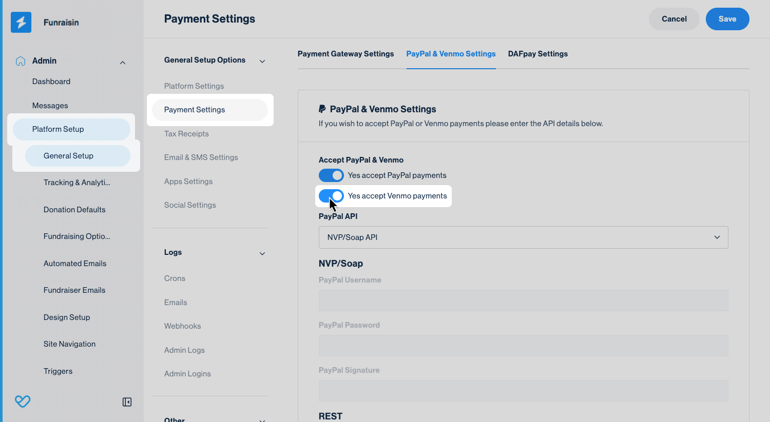 Tip! Venmo is only supported when your PayPal integration uses REST API credentials. If your platform is connected using PayPal’s NVP/SOAP API, Venmo will not appear as a payment option. To enable Venmo, you’ll need to request REST API access from PayPal and update your PayPal settings in Funraisin.