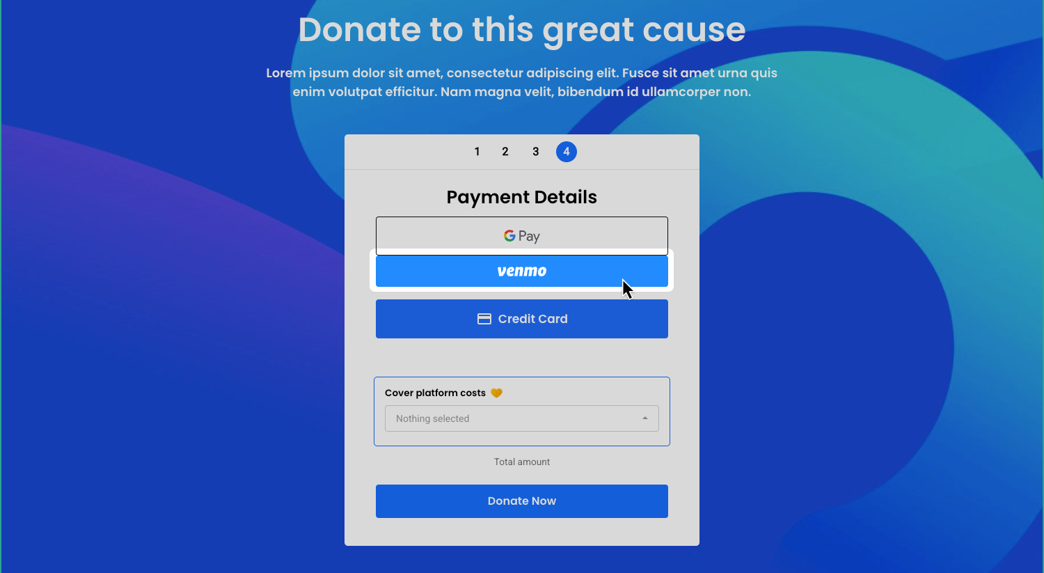 Once enabled, Venmo will appear alongside other payment options on your donation form.