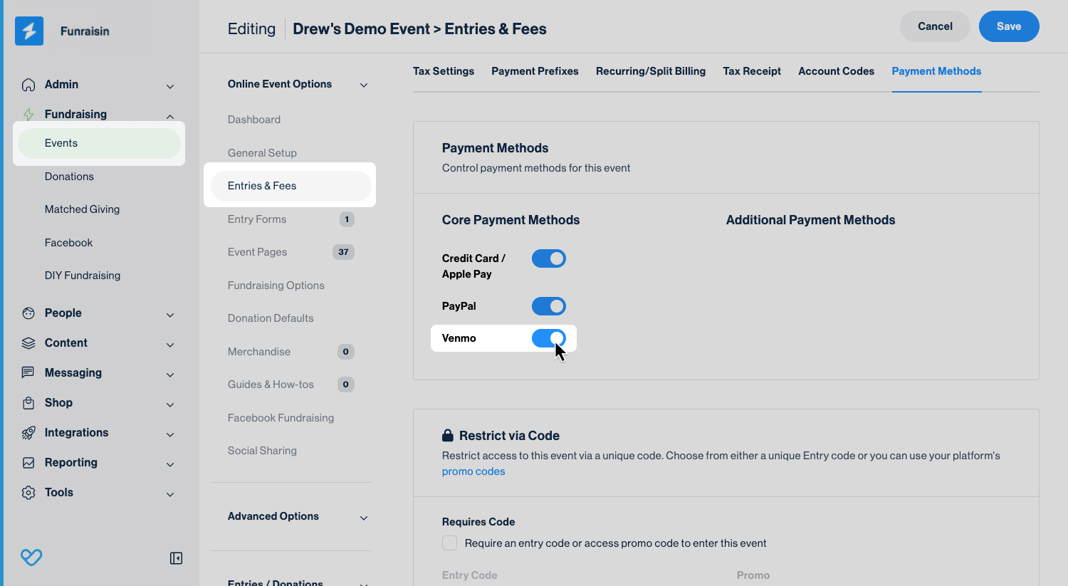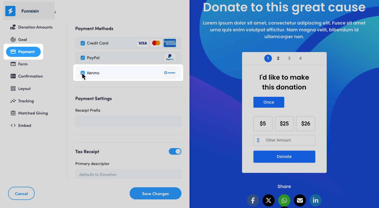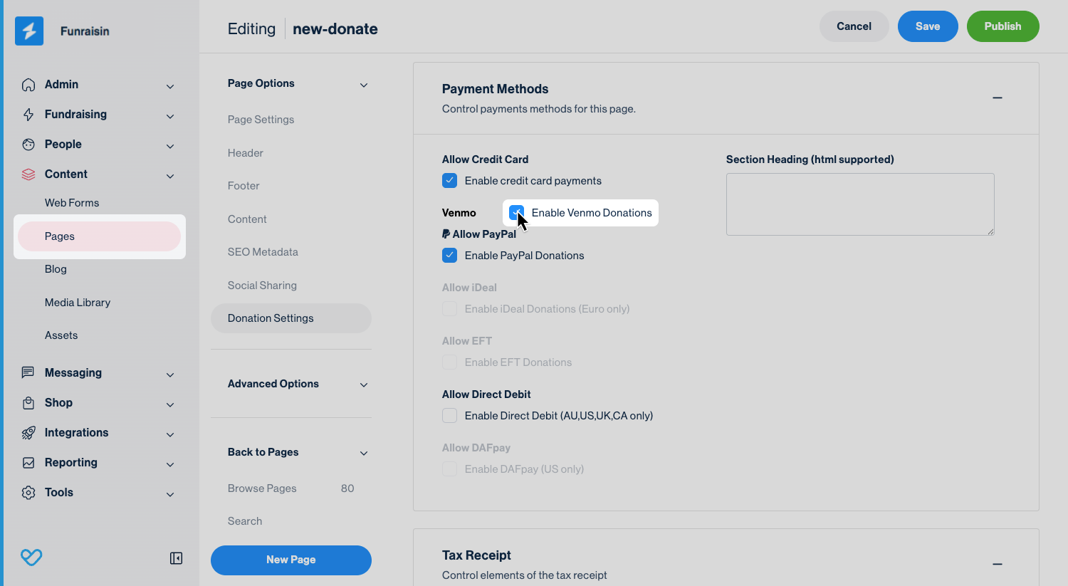 - Scroll to Payment Methods and tick Enable Venmo Donations
