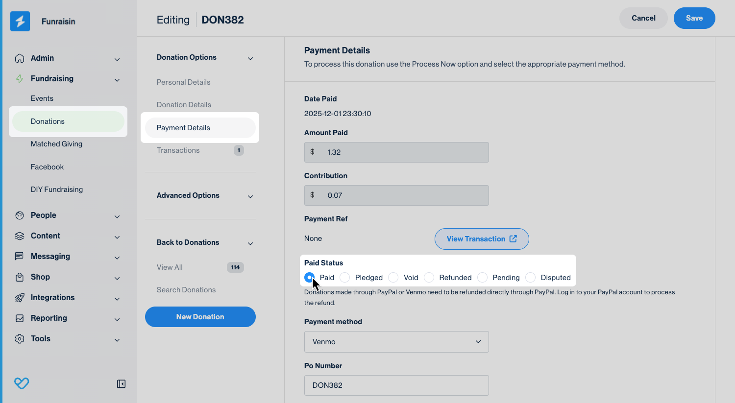 At this time, refunds for Venmo and PayPal payments aren’t supported directly within Funraisin. If you need to issue a refund, it must be processed through your PayPal account.