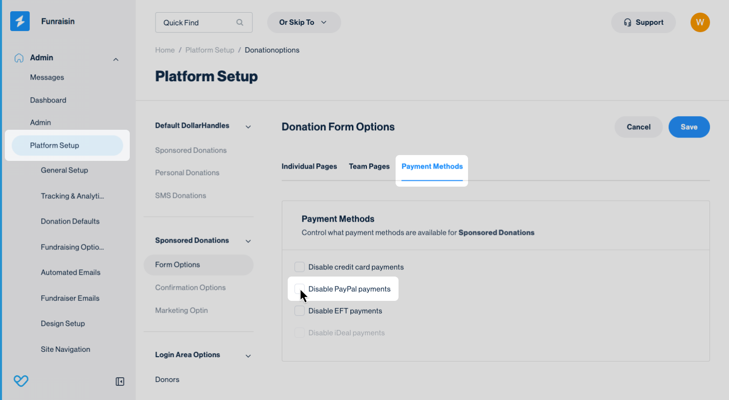 - Go to Platform Setup > Donation Defaults > Sponsored Donations > Form Options