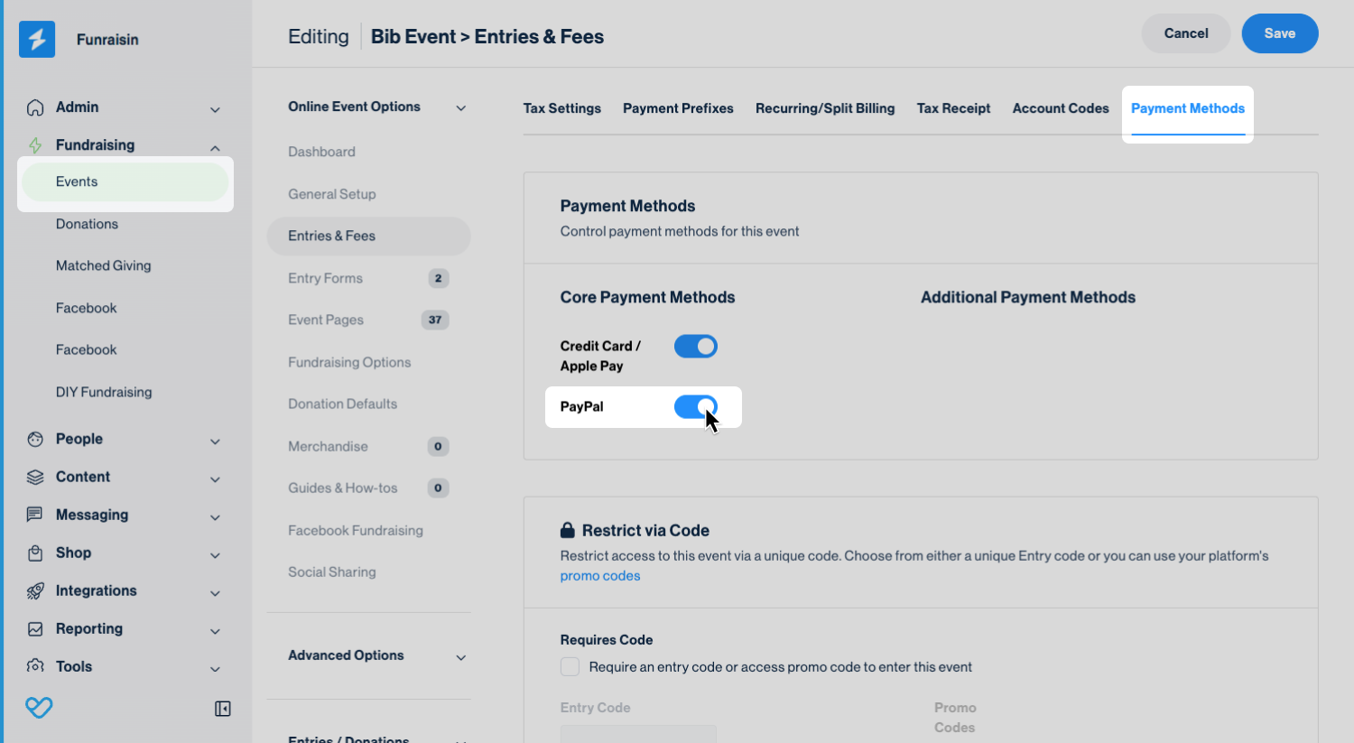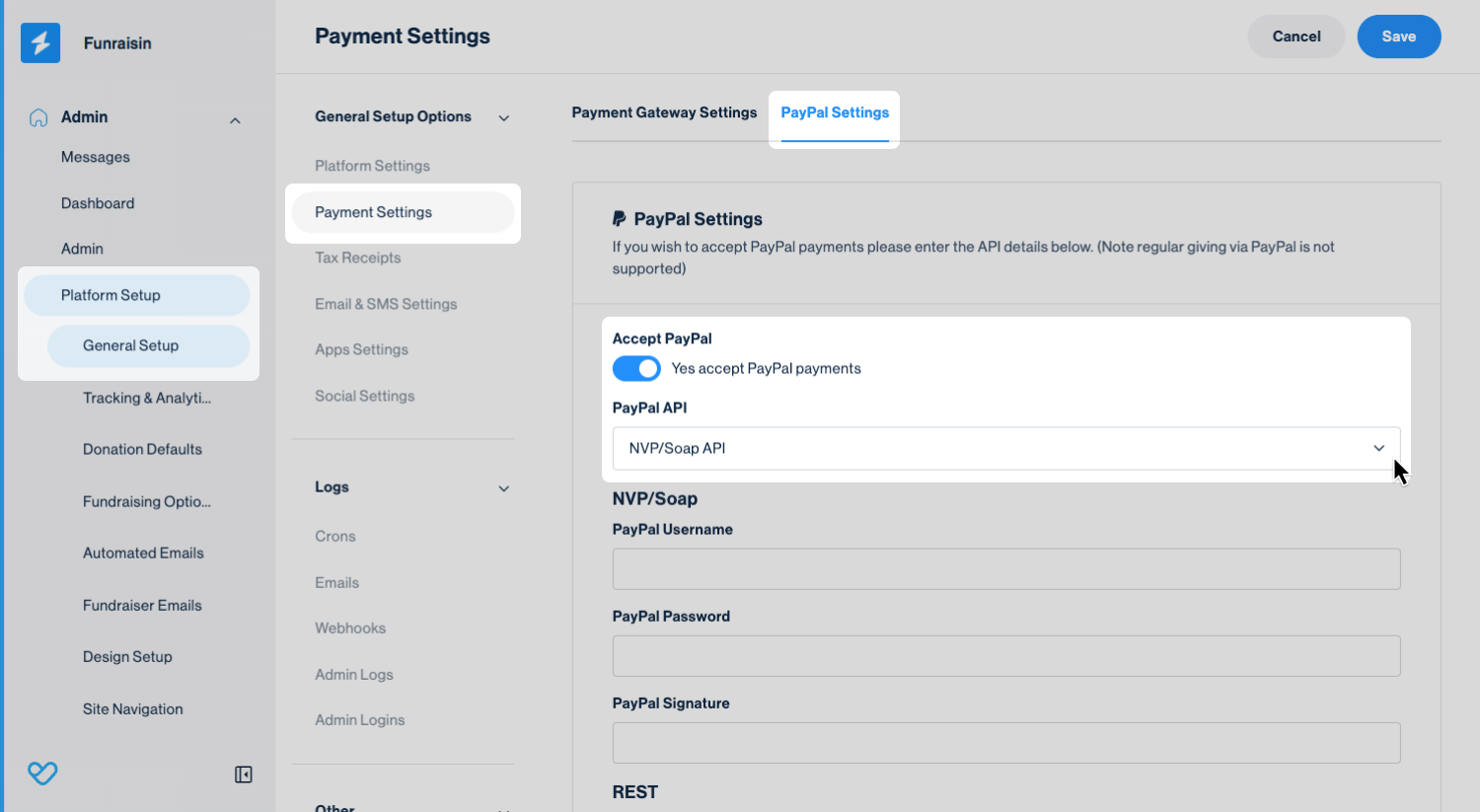 Once you’ve retrieved your NVP/SOAP and/or REST API credentials from PayPal, you can enable PayPal directly within your Funraisin admin.